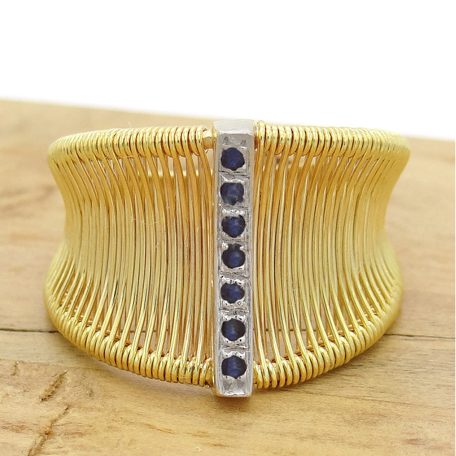 Anel Aramado com 7 Safiras, em Ouro Amarelo 18 Kilates