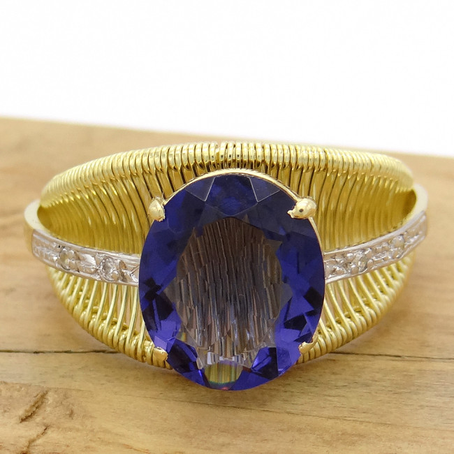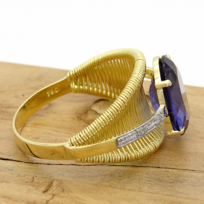 Anel Aramado com Cristal de Tanzanita e 4 Diamantes, em Ouro Amarelo 18 Kilates