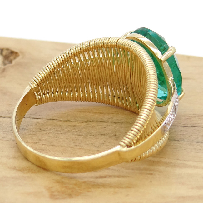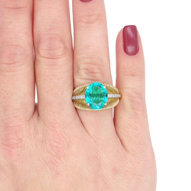 Anel Aramado com Cristal de Turmalina Paraíba e 4 Diamantes, em Ouro Amarelo 18 Kilates