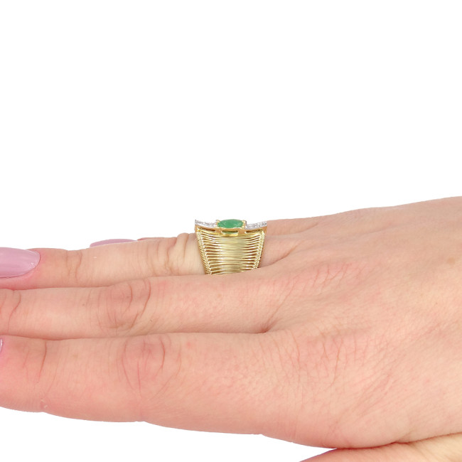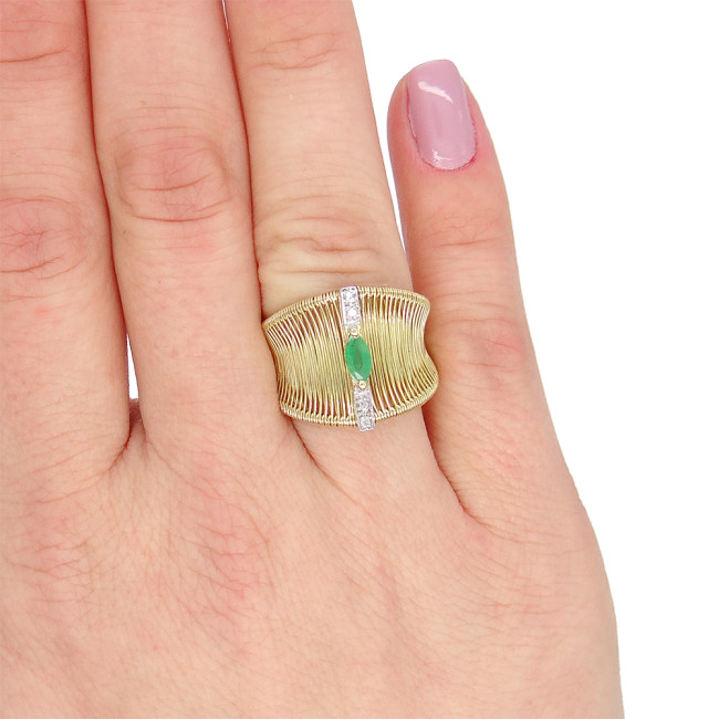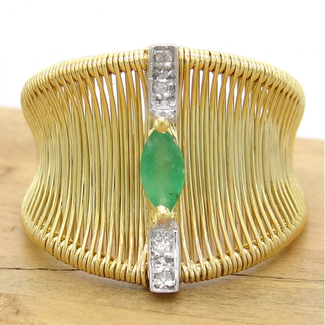 Anel Aramado com Esmeralda e 4 Diamantes, em Ouro Amarelo 18 Kilates