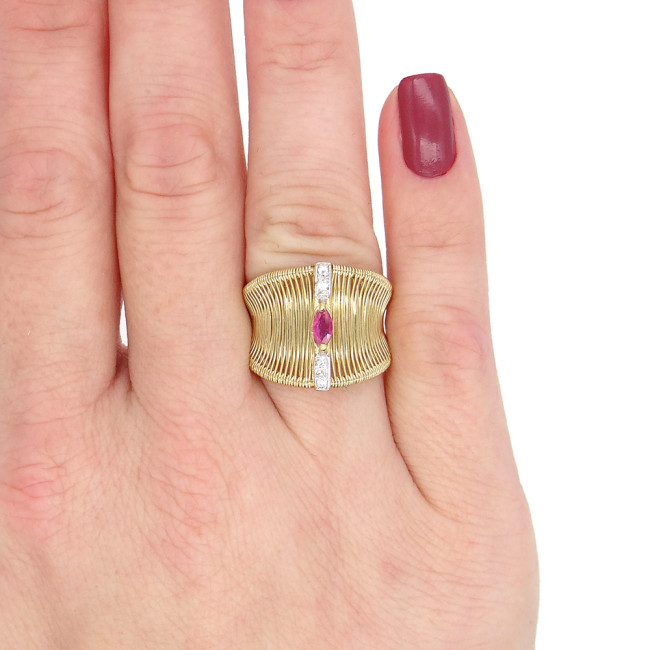 Anel Aramado com Rubi e 4 Diamantes, em Ouro Amarelo 18 Kilates