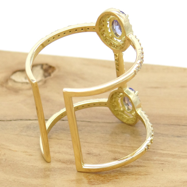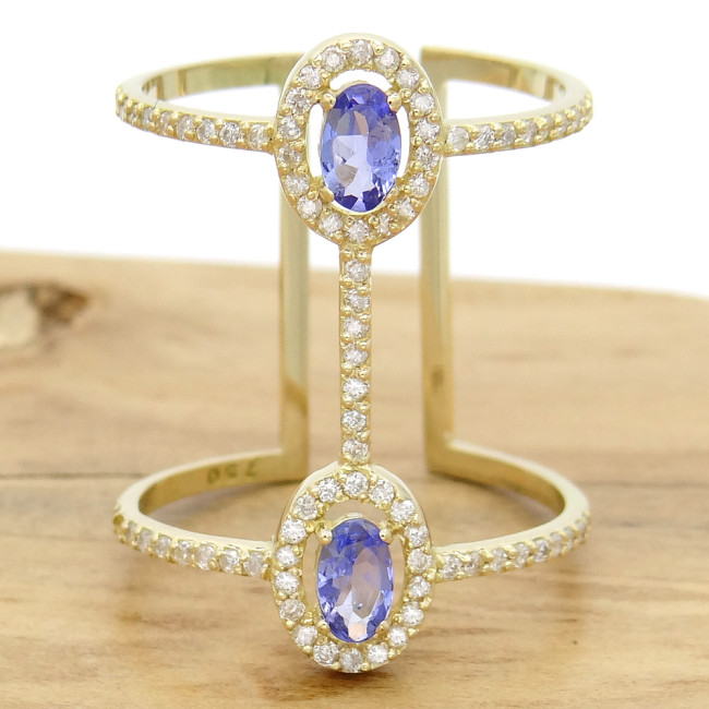 Anel Aro Duplo com 2 Tanzanitas Naturais Totalizando 45 Pontos e 78 Diamantes, em Ouro Amarelo 18 Kilates