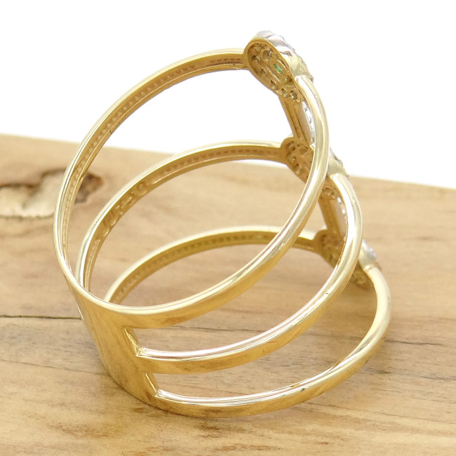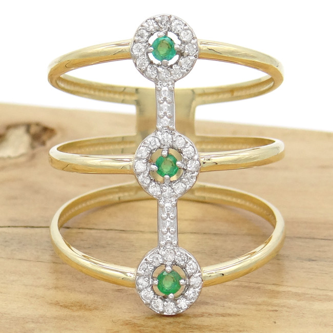 Anel Aro Triplo com 3 Esmeraldas Totalizando 15 Pontos e 36 Diamantes, em Ouro Amarelo 18 Kilates
