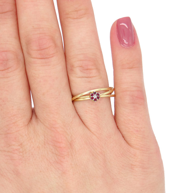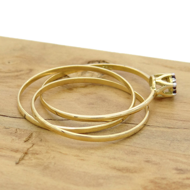 Anel Chuveiro, 3 Aros com 6 Rubis e 1 Diamante, em Ouro Amarelo 18 Kilates