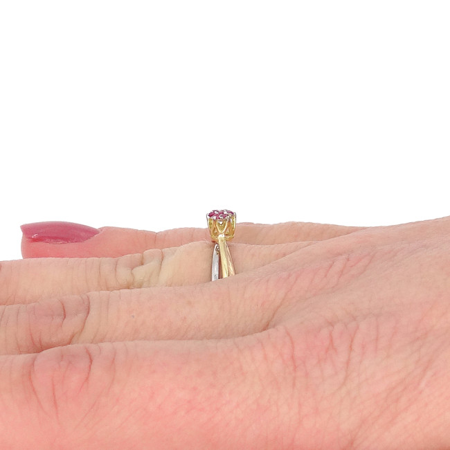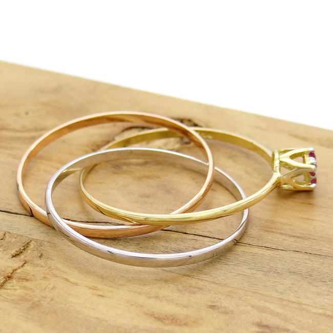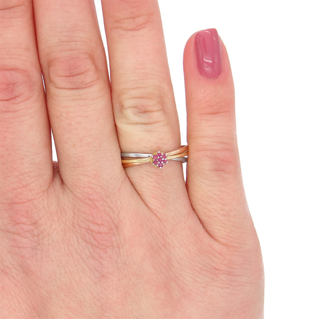 Anel Chuveiro, 3 Aros com 7 Rubis, em Ouro Amarelo, Branco e Rose 18 Kilates