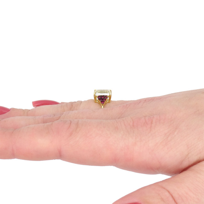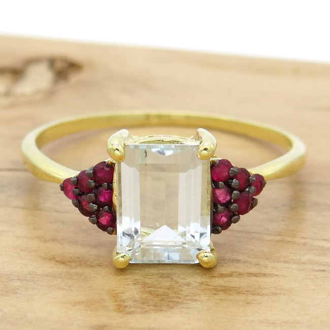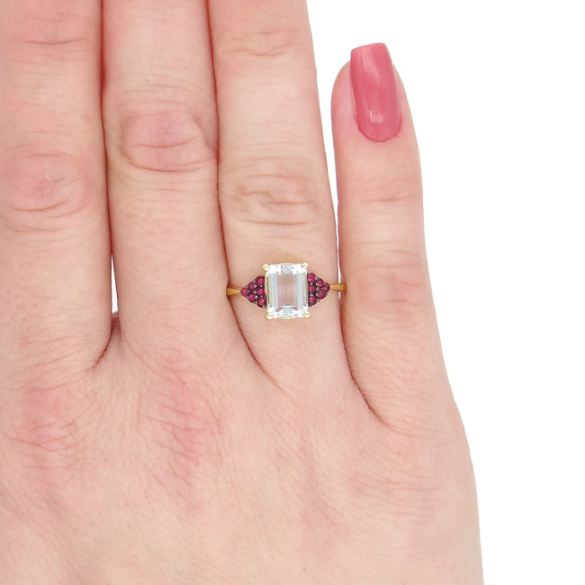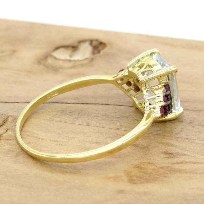 Anel  com Água Marinha de 1,3 Kilates e 12 Rubis, em Ouro Amarelo 18 Kilates