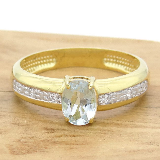 Anel  com Água Marinha de 1 Cts e 6 Diamantes, em Ouro Amarelo 18 Kilates