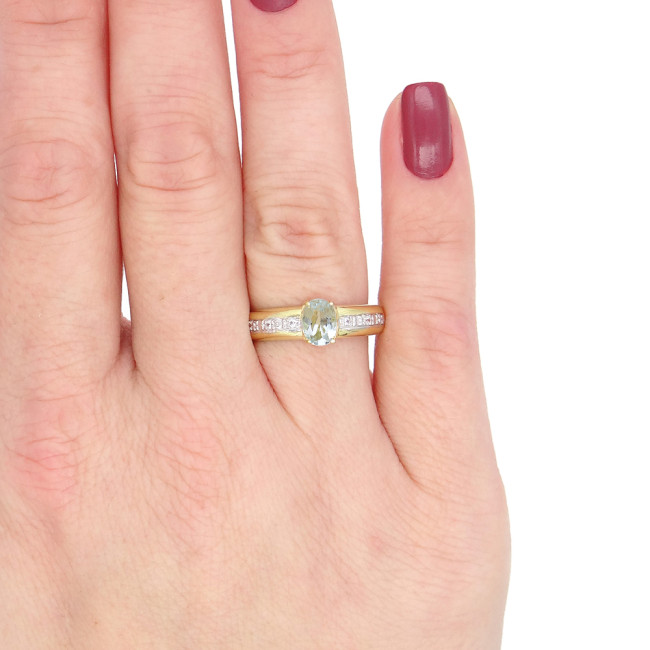Anel com Água Marinha de 1 Cts e 6 Diamantes, em Ouro Amarelo 18 Kilates