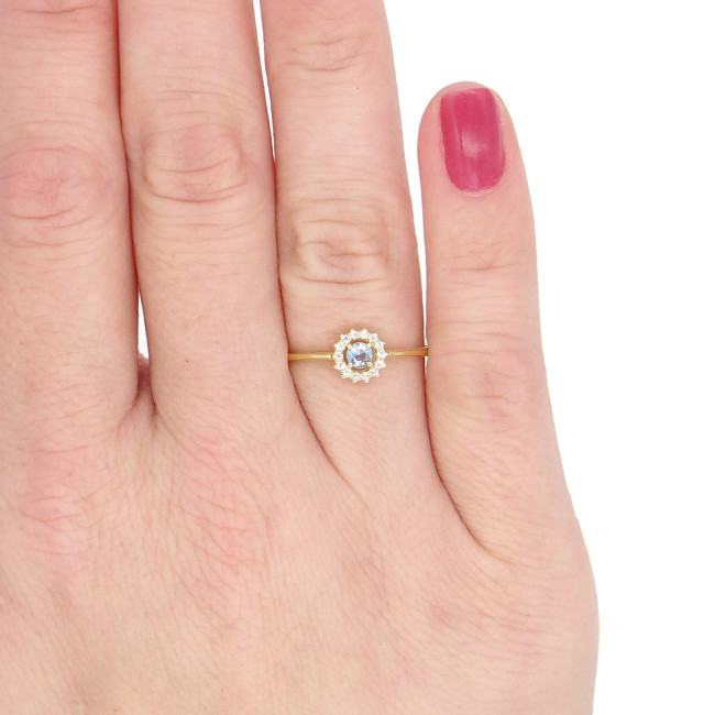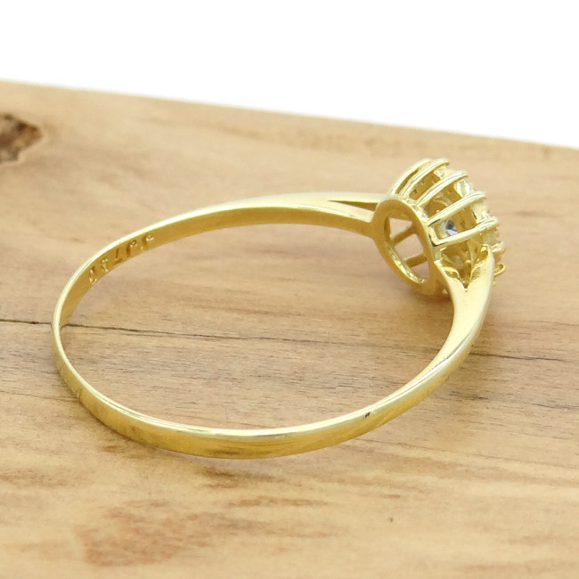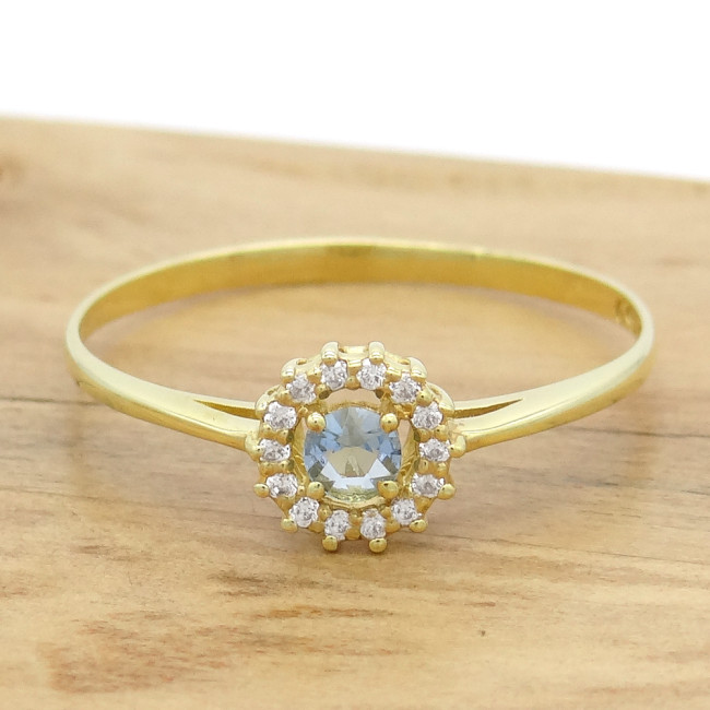 Anel com Água Marinha de 10 Pontos e 14 Diamantes, em Ouro Amarelo 18 Kilates