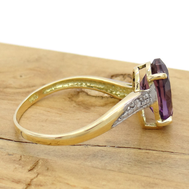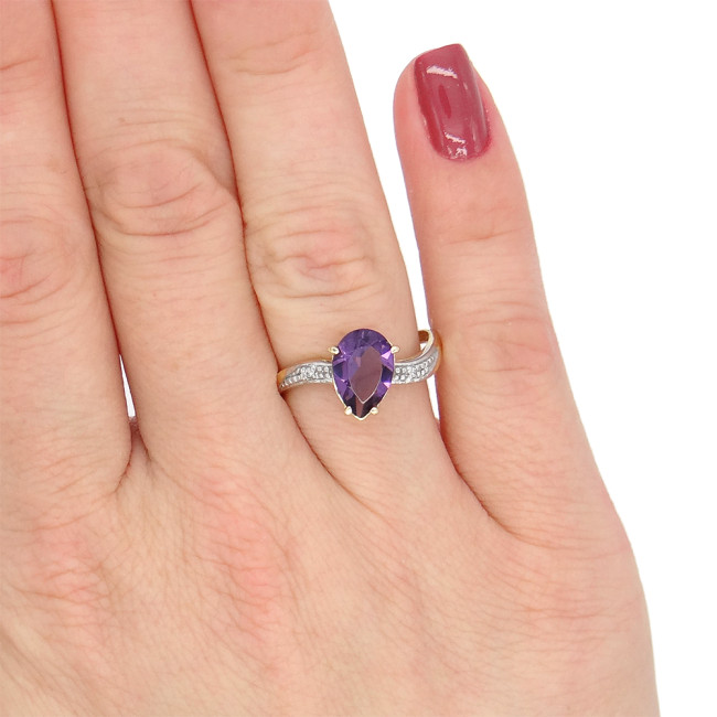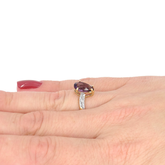 Anel com Ametista Gota e 2 Diamantes, em Ouro Amarelo 18 Kilates