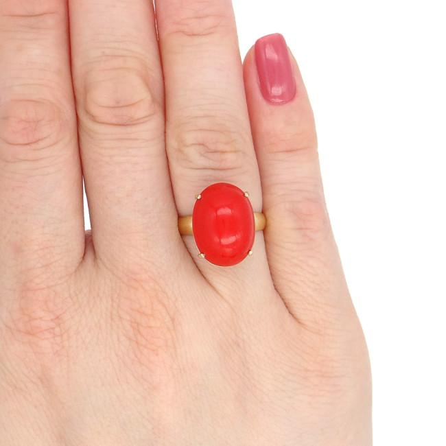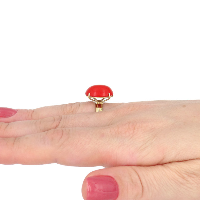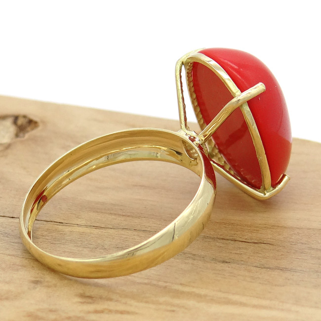 Anel com Coral Cabochon, em Ouro Amarelo 18 Kilates