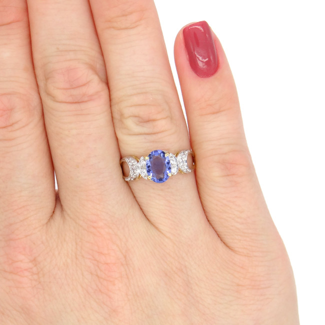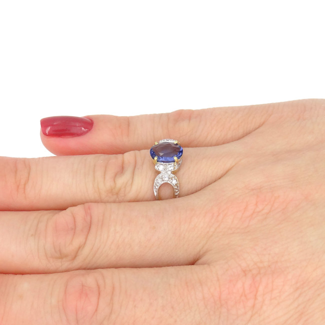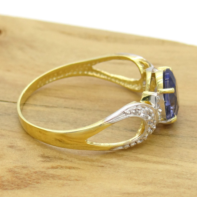 Anel com Cristal de Tanzanita e 8 Diamantes, em Ouro Amarelo 18 Kilates