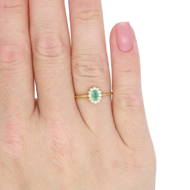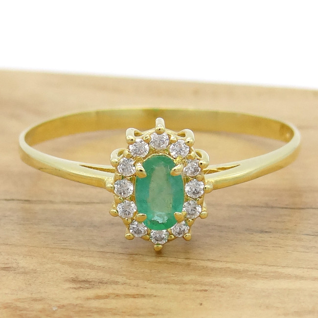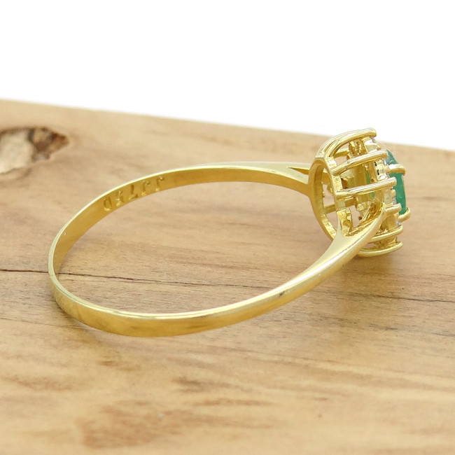 Anel com Esmeralda de 20 Pontos e 12 Diamantes, em Ouro Amarelo 18 Kilates