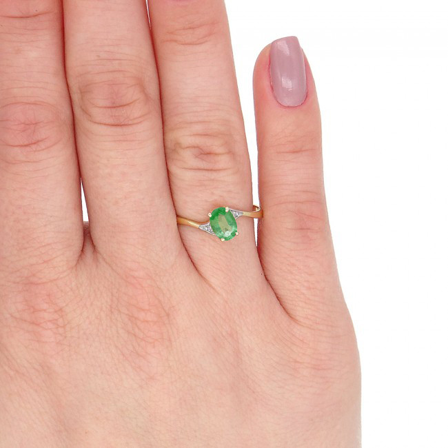 Anel com Esmeralda e 2 Diamantes, em Ouro Amarelo 18 Kilates