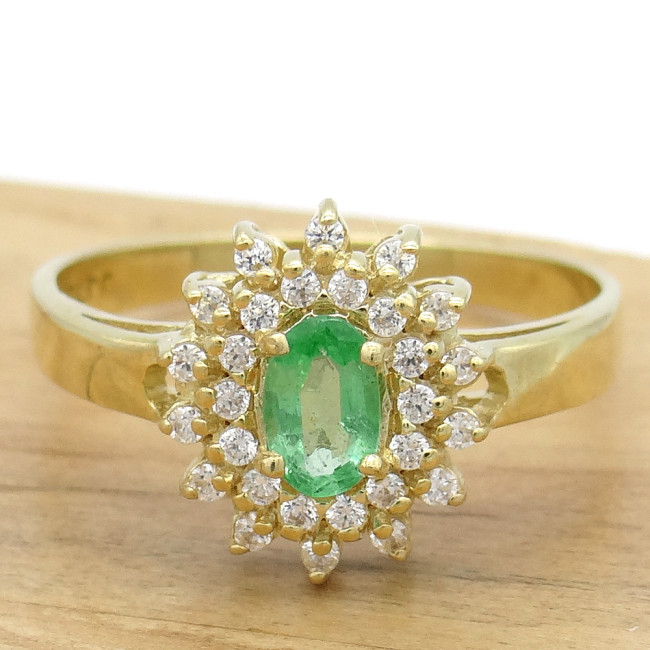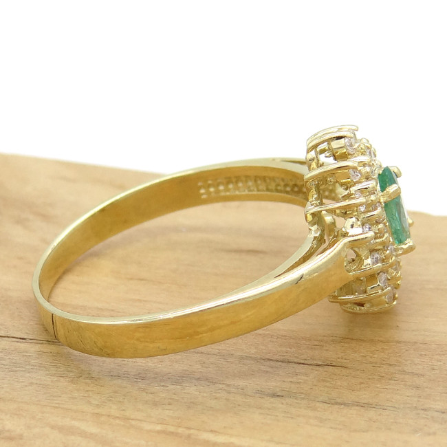 Anel com Esmeralda e 28 Diamantes, em Ouro Amarelo 18 Kilates