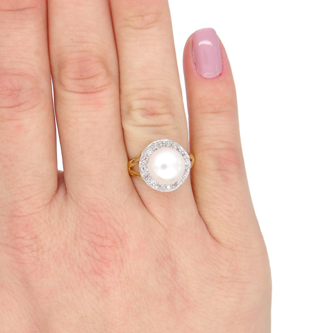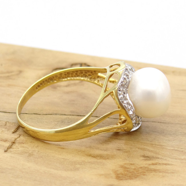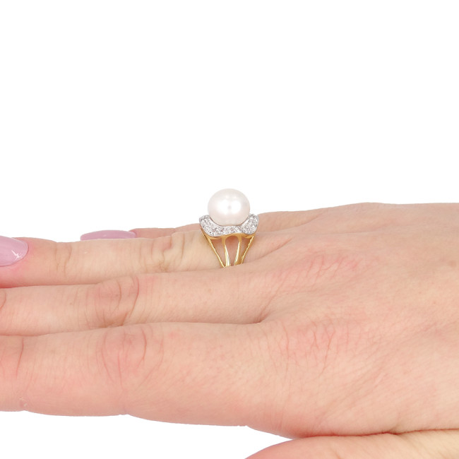 Anel com Pérola de 10 mm e 16 Diamantes, em Ouro Amarelo 18 Kilates
