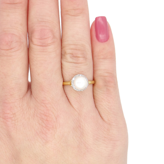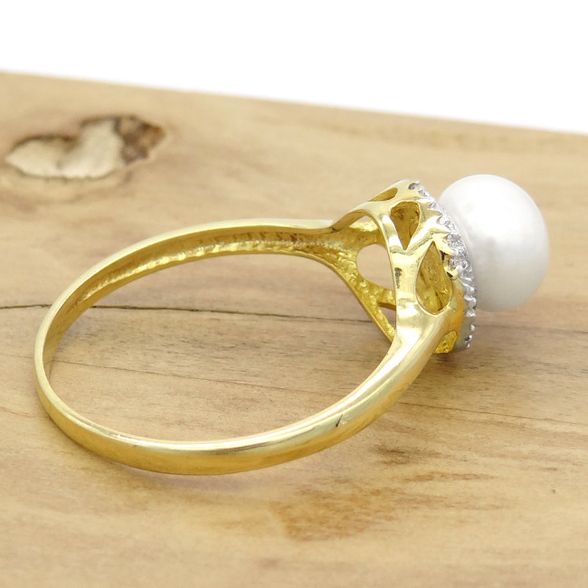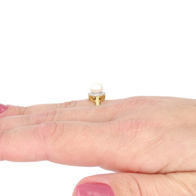 Anel com Pérola de 7 mm e 6 Diamantes, em Ouro Amarelo 18 Kilates