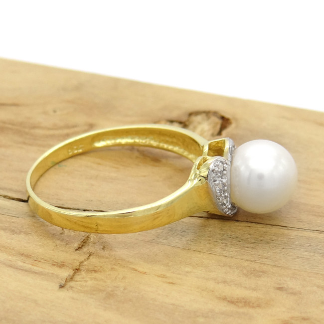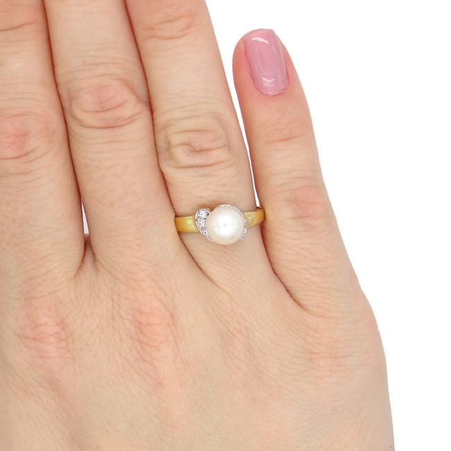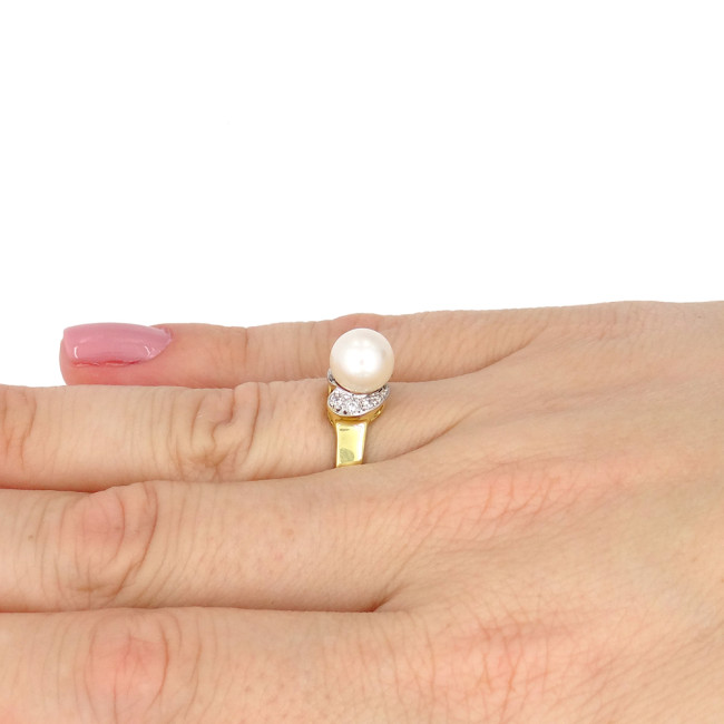 Anel com Pérola de 8 mm e 6 Diamantes, em Ouro Amarelo 18 Kilates