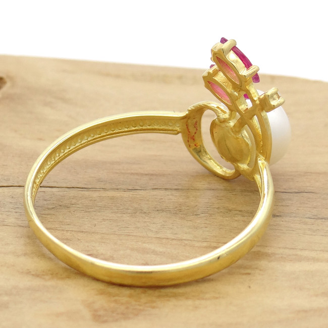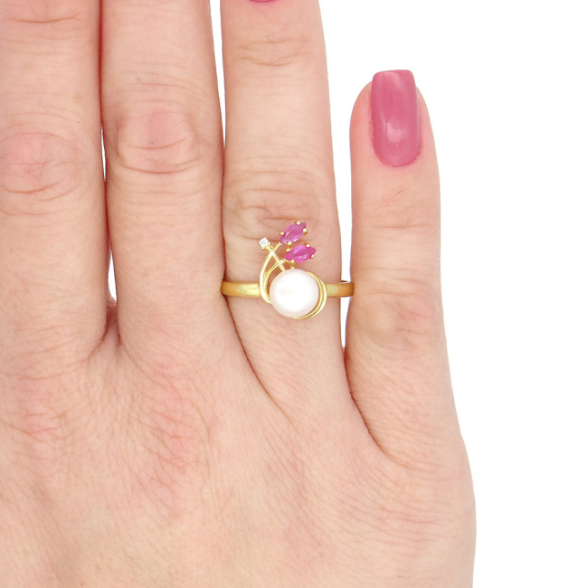 Anel com Pérola Natural de 7 mm, 2 Rubis e Diamante, em Ouro Amarelo 18 Kilates