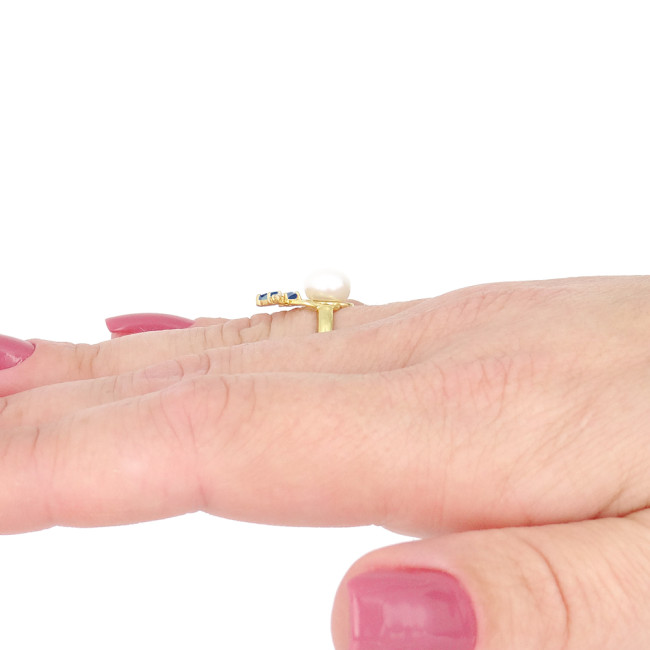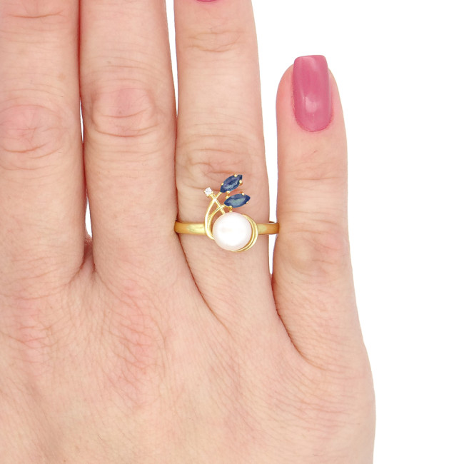 Anel com Pérola Natural de 7 mm, 2 Safiras e Diamante, em Ouro Amarelo 18 Kilates