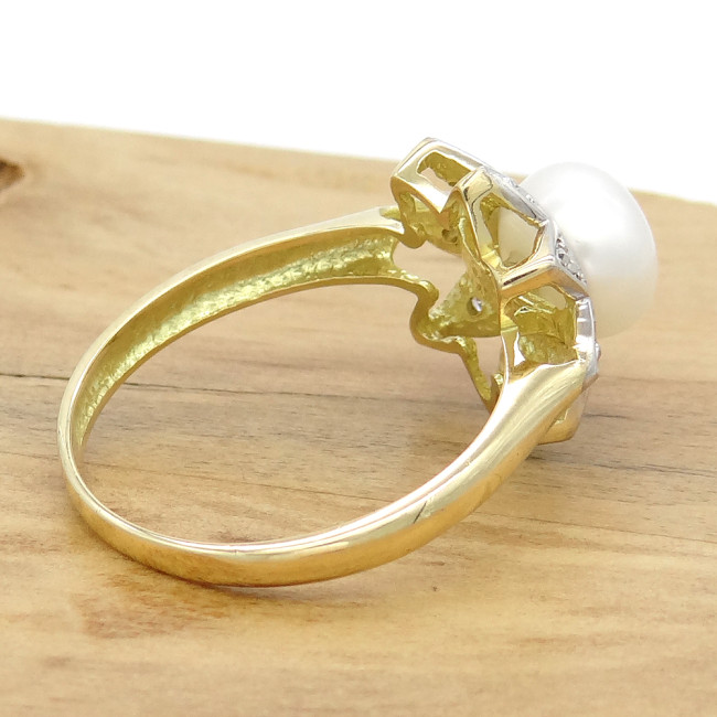 Anel com Pérola Natural de 7 mm e 8 Diamantes, em Ouro Amarelo 18 Kilates