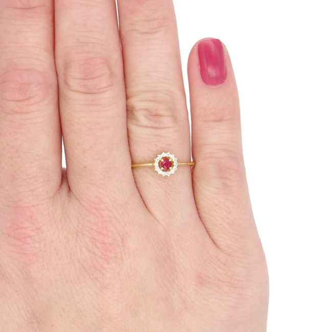 Anel com Rubi de 10 Pontos e 14 Diamantes, em Ouro Amarelo 18 Kilates