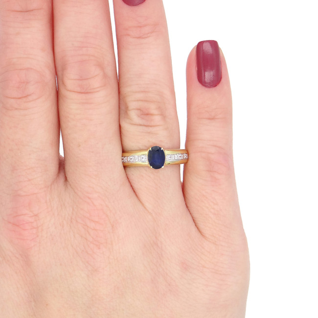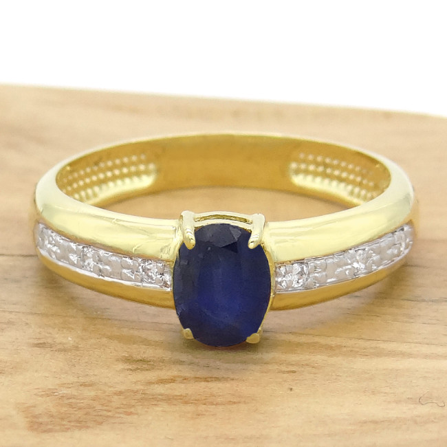 Anel com Safira de 1 Cts e 6 Diamantes, em Ouro Amarelo 18 Kilates