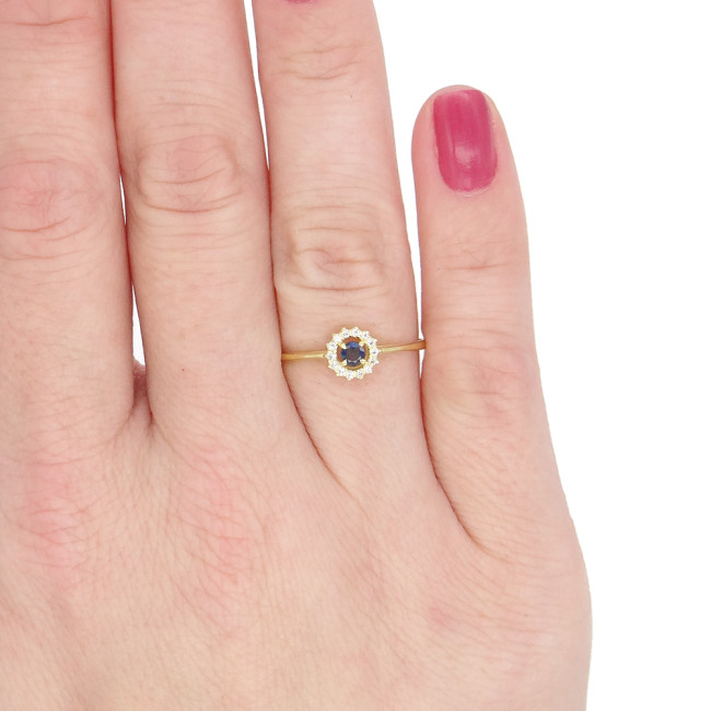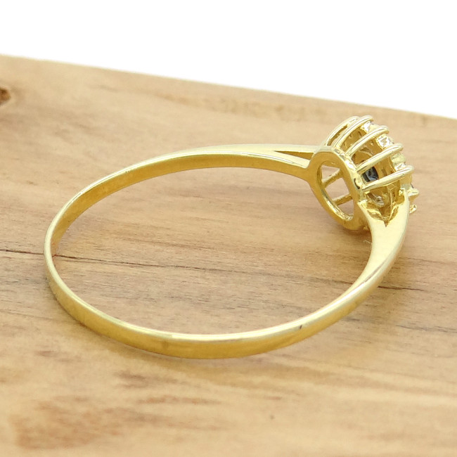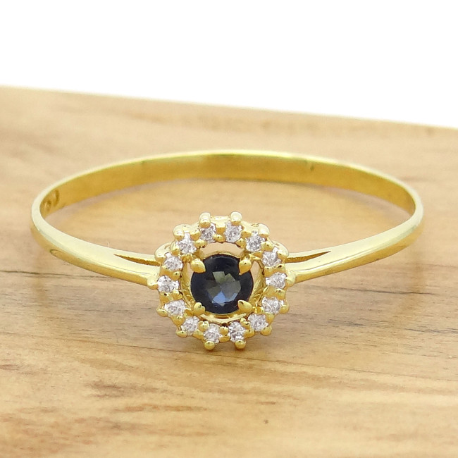 Anel com Safira de 10 Pontos e 14 Diamantes, em Ouro Amarelo 18 Kilates
