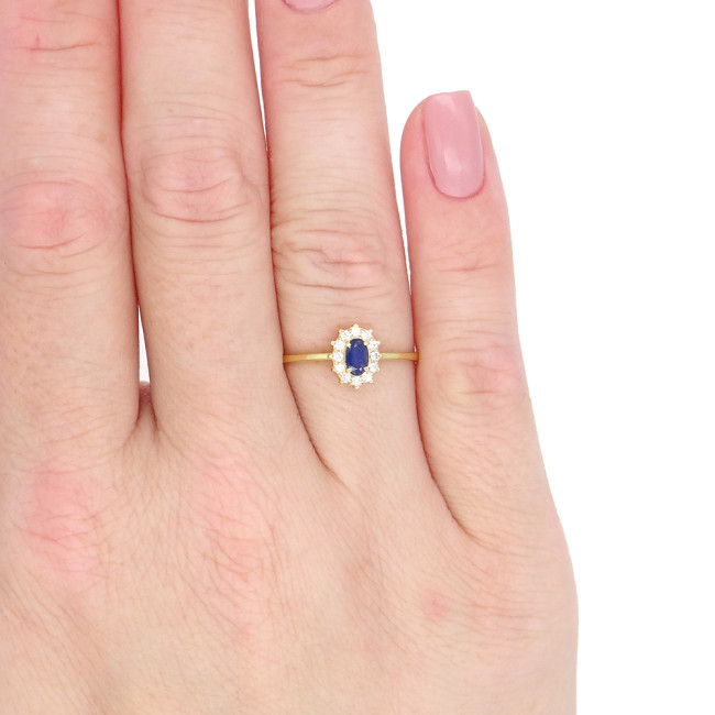 Anel com Safira de 30 Pontos e 12 Diamantes, em Ouro Amarelo 18 Kilates