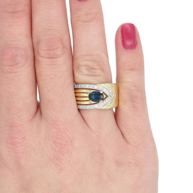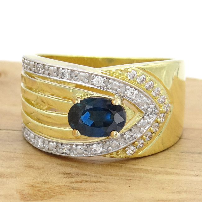 Anel com Safira e 22 Diamantes, em Ouro Amarelo 18 Kilates