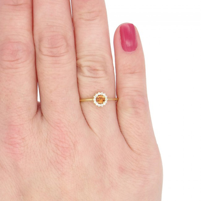 Anel com Safira Laranja Natural de 15 pontos e 14 Diamantes, em Ouro Amarelo 18 Kilates