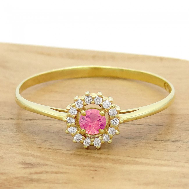 Anel com Safira Rosa Natural de 15 pontos e 14 Diamantes, em Ouro Amarelo 18 Kilates