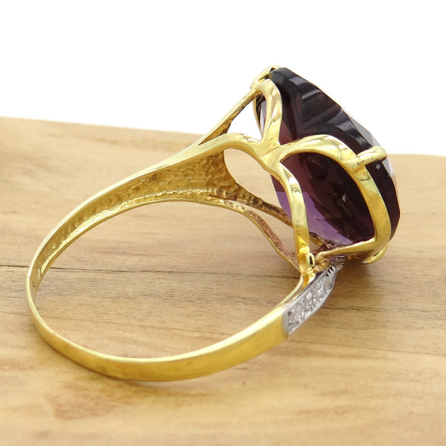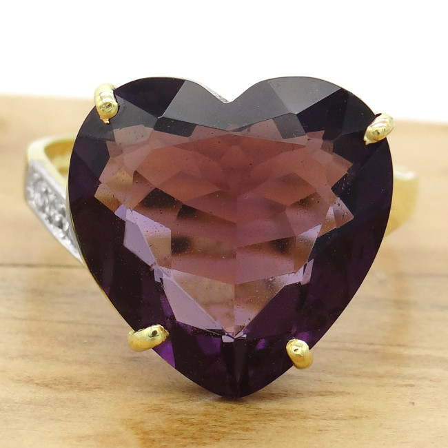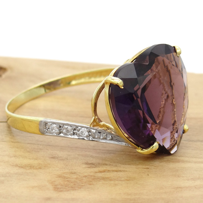 Anel Coração de Ametista e 3 Diamantes, em Ouro Amarelo 18 Kilates