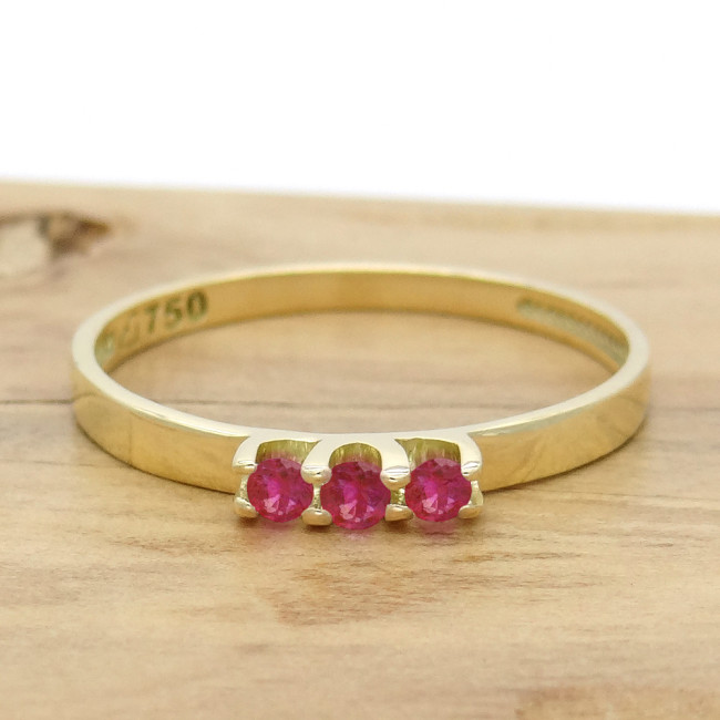 Anel Estilo Solitário com 3 Rubis Totalizando 15 Pontos, em Ouro Amarelo 18 Kilates