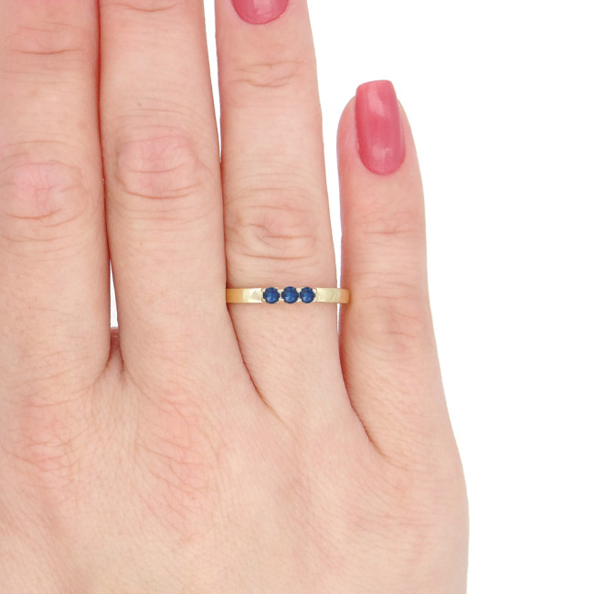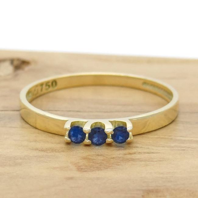 Anel Estilo Solitário com 3 Safiras Totalizando 15 Pontos, em Ouro Amarelo 18 Kilates