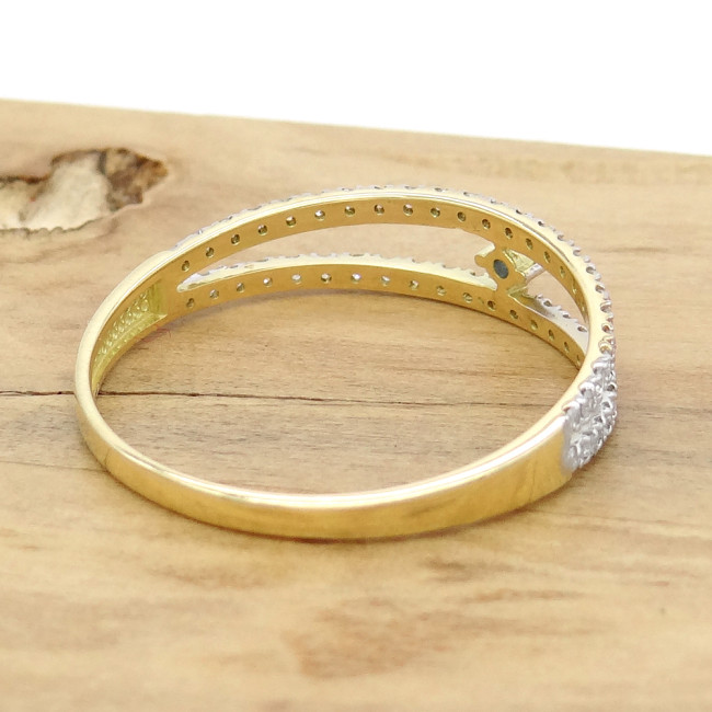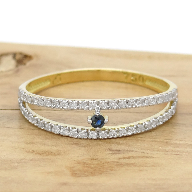 Anel Estilo Solitário com Safira Central de 3 Pontos e 48 Diamantes, em Ouro Amarelo 18 Kilates