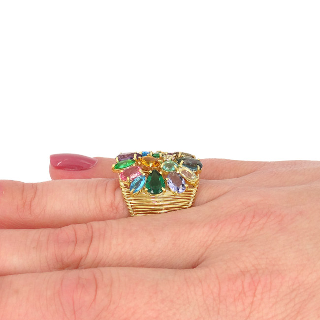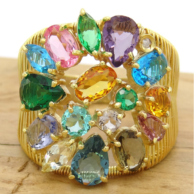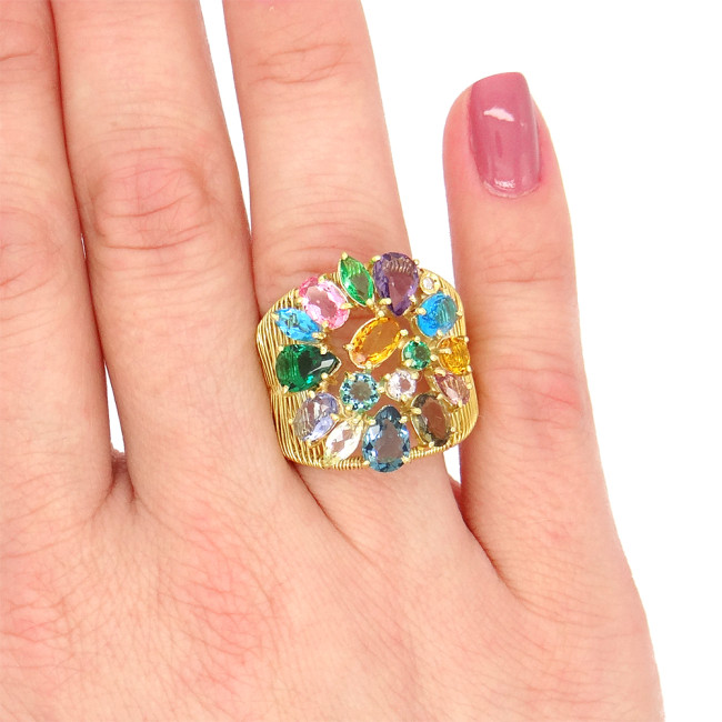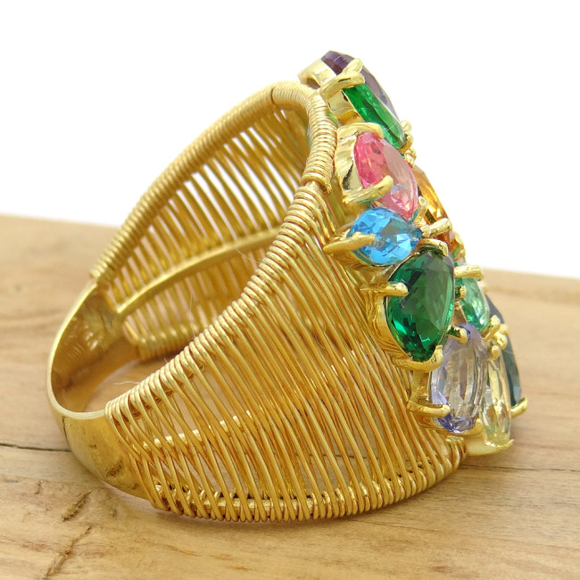 Anel Flor Aramado com Mix de Gemas Brasileiras, em Ouro Amarelo 18 Kilates