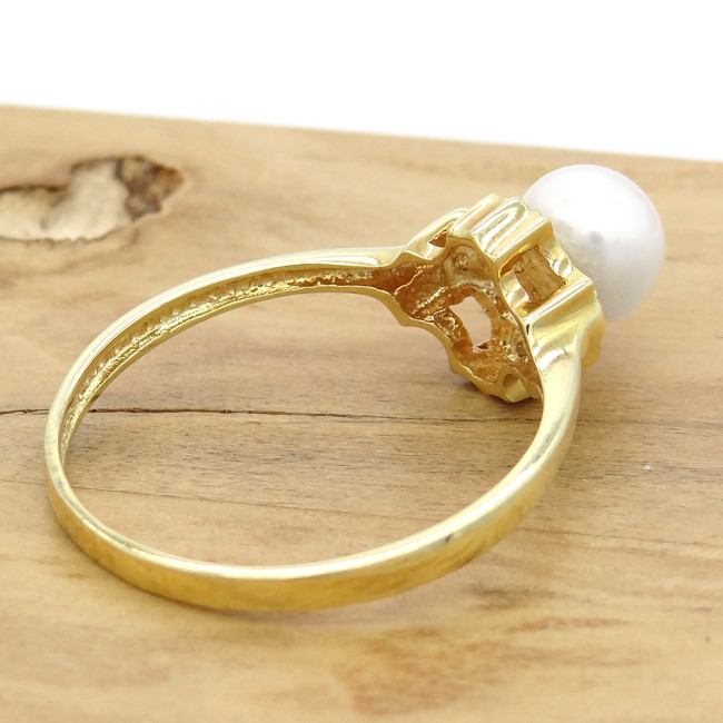 Anel Flor com Pérola Natural de 6 mm e 4 Diamantes, em Ouro Amarelo 18 Kilates