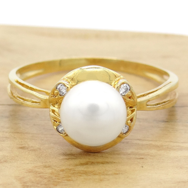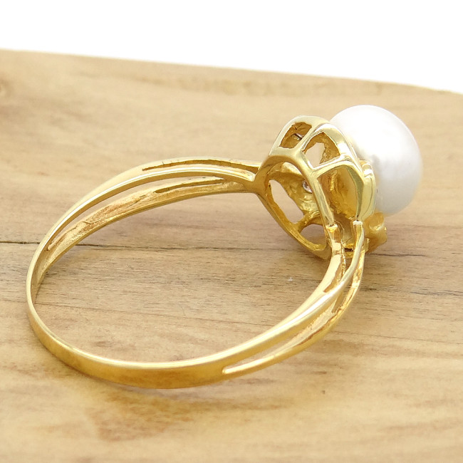 Anel Flor com Pérola Natural de 7 mm e 4 Diamantes, em Ouro Amarelo 18 Kilates