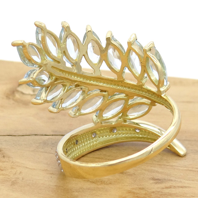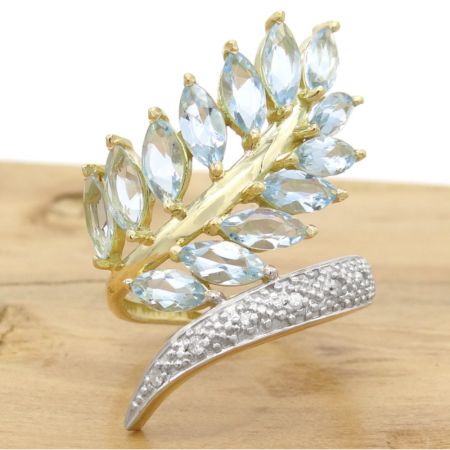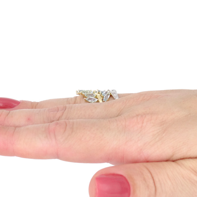 Anel Floral com 13 Águas Marinhas e 7 Diamantes, em Ouro Amarelo 18 Kilates