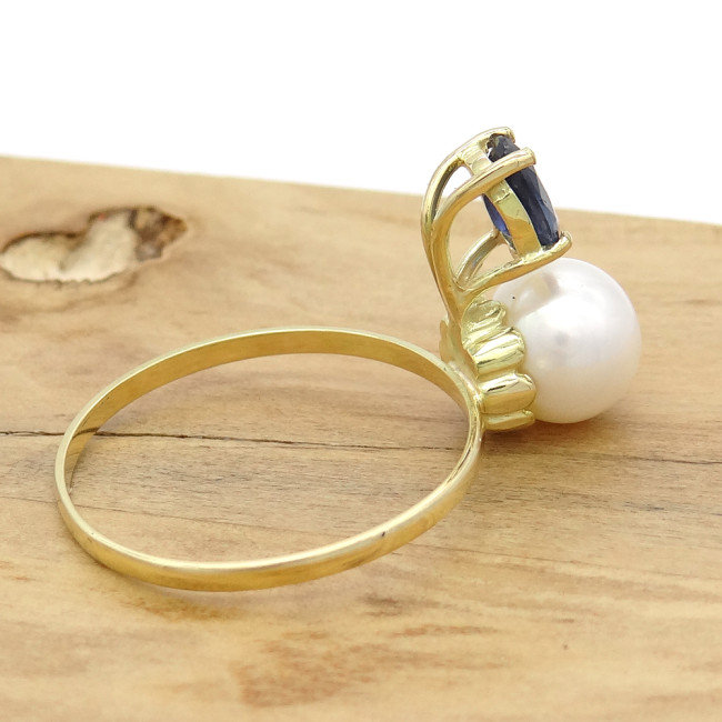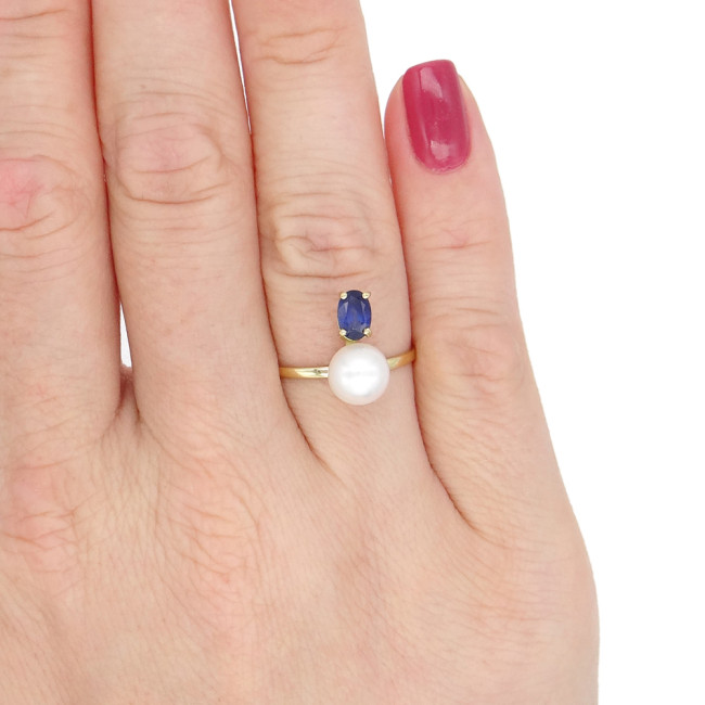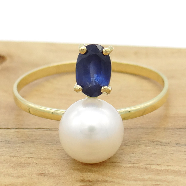 Anel Pérola 6 mm com Safira, em Ouro Amarelo 18 Kilates