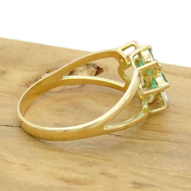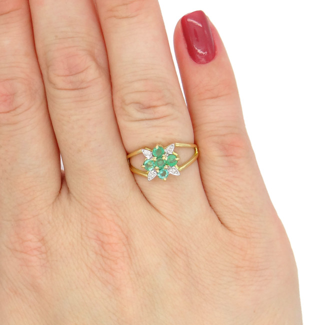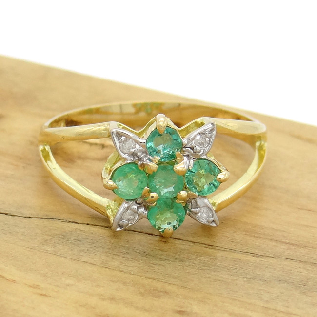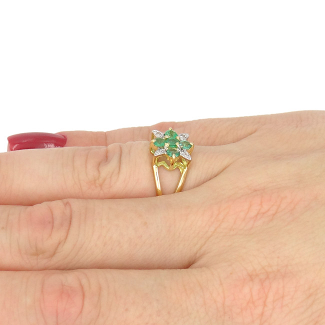 Anel Chuveiro com Esmeraldas e Diamates, em Ouro Amarelo 18 Kilates