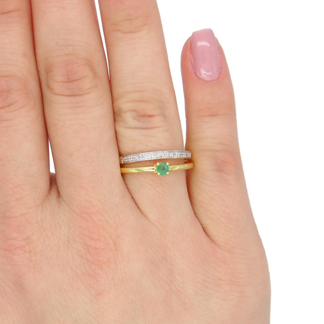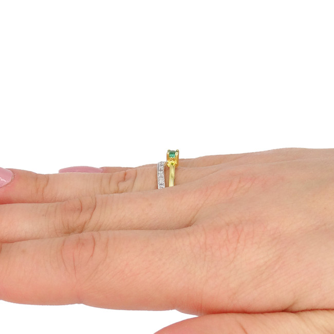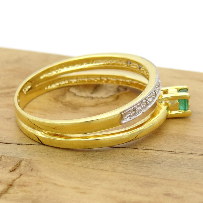 Anel Solitário com Esmeralda e 8 Diamantes, em Ouro Amarelo 18 Kilates