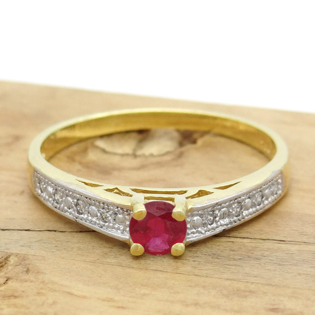 Anel Solitário com Rubi de 15 Pontos e 8 Diamantes, em Ouro Amarelo 18 Kilates