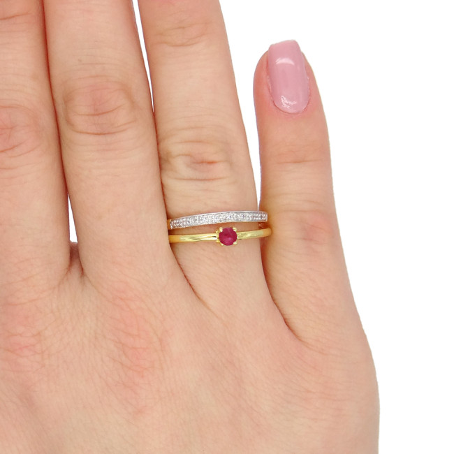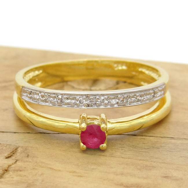 Anel Solitário com Rubi e 8 Diamantes, em Ouro Amarelo 18 Kilates