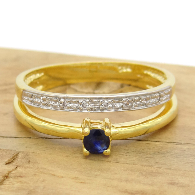 Anel Solitário com Safira e 8 Diamantes, em Ouro Amarelo 18 Kilates