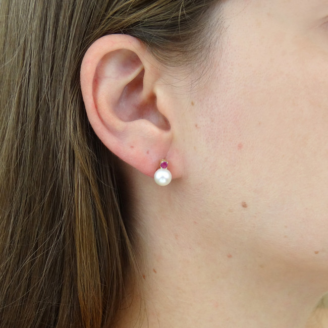 Par de Brincos com Pérolas Naturais de 6 mm e Rubis, em Ouro Amarelo 18 Kilates