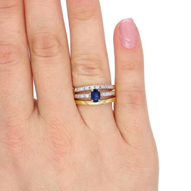 Meia Aliança 3 Aros com Safira e 14 Diamantes, em Ouro Amarelo 18 Kilates