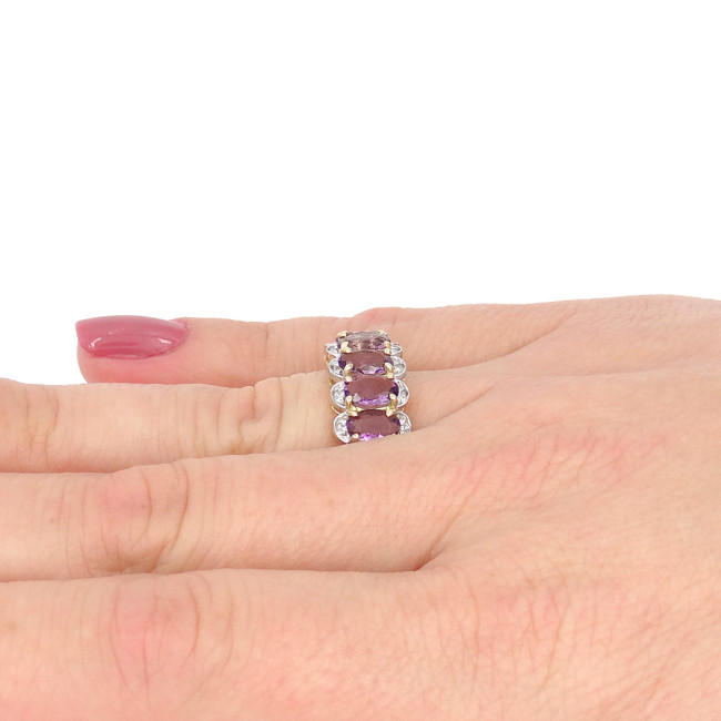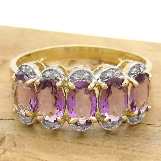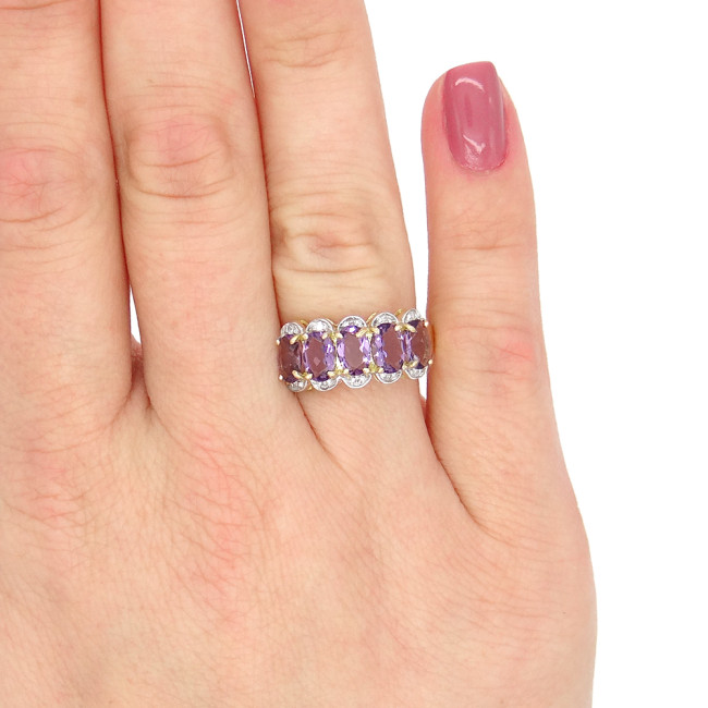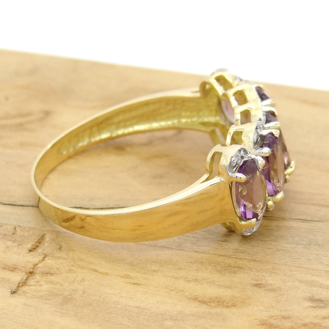 Meia Aliança com 5 Ametistas e 10 Diamantes, em Ouro Amarelo 18 Kilates