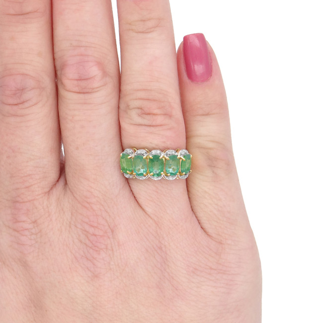 Meia Aliança com 5 Esmeraldas Totalizando 3,25 Cts e 10 Diamantes, em Ouro Amarelo 18 Kilates